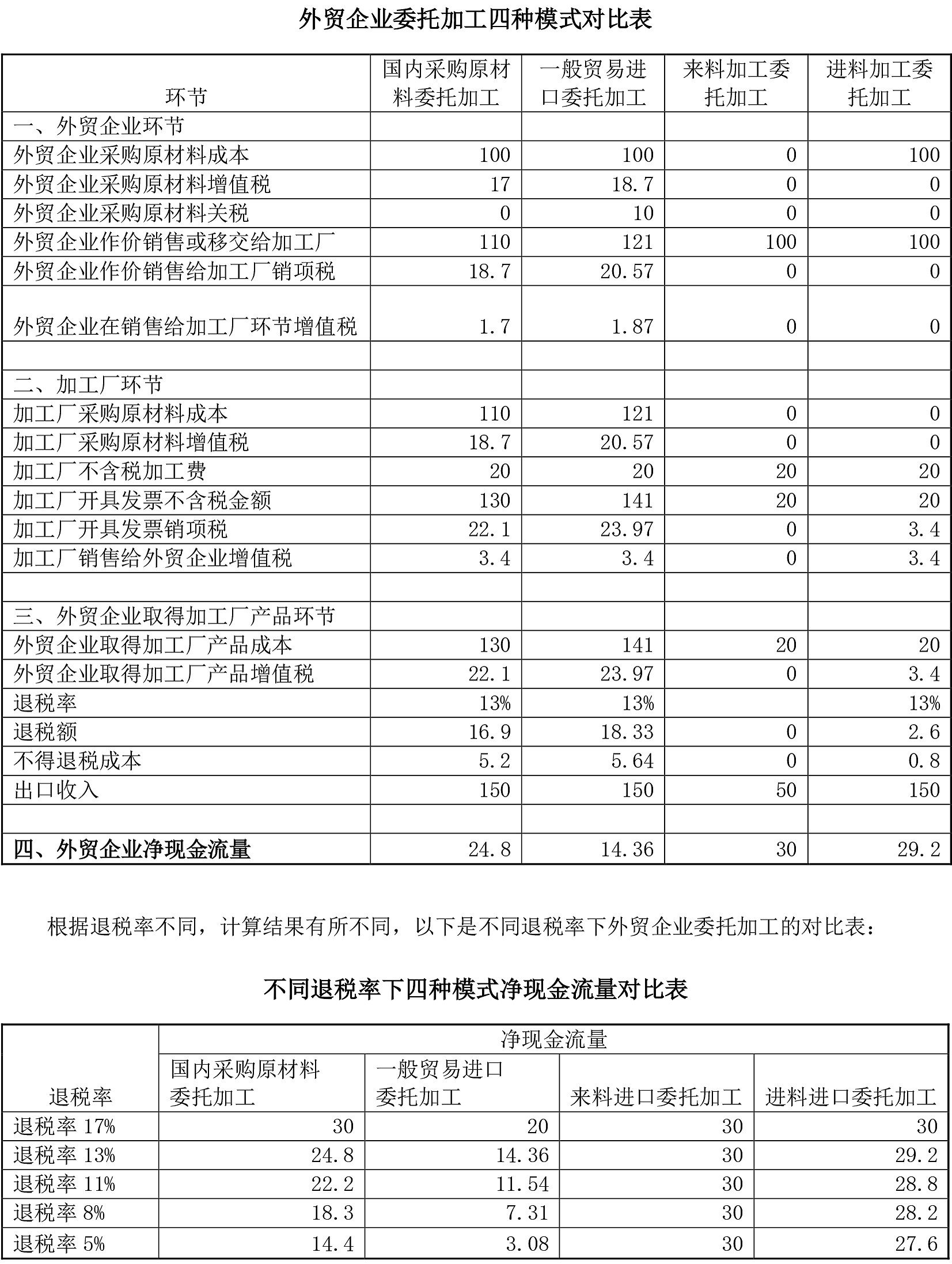 笔者以外贸企业委托加工出口的净现金流量为目标值,阐述四种模式的操作方法,并举例说明方案优劣,纳税人可根据实际情况进行选择。