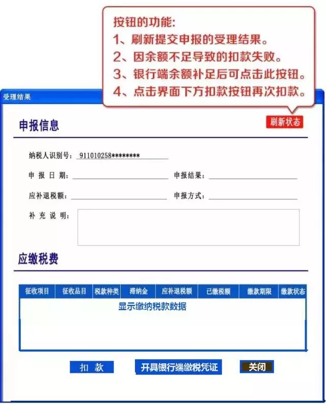 申报表填写完成上传后,请一定点击受理结果,显示申报成功,说明您大功告成,如果本月有税款,受理结果旁有刷新状态图标,想什么时候扣款就什么时间扣,不过可千万别超过期限哟!