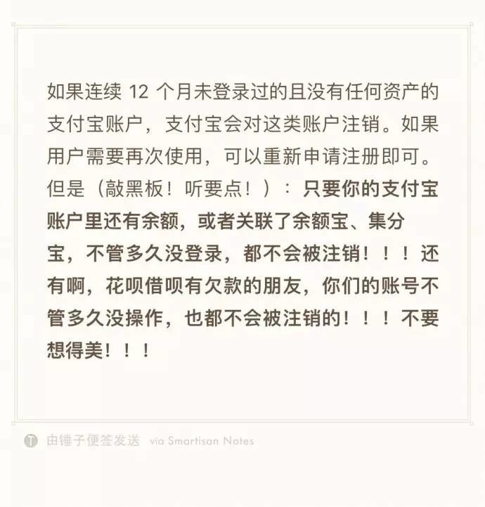为了防止资源占用,如您连续12个月未使用您的支付宝登录名或支付宝认可的其他方式登录过您的会员号或账户,支付宝会对该会员号或账户进行注销,您将不能再通过该支付宝登录名登录本网站或使用相关会员号或者账户。如该会员号或账户有关联的理财产品、待处理交易或余额,支付宝会协助您处理,请您按照支付宝提示的方式进行操作。如您自开立支付宝账户之日起6个月内无主动交易,则向您重新核实身份之前,支付宝将有权暂停或者注销该支付宝账户。