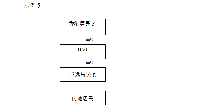 示例5投资架构,为本条第一款第(一)项规定的情形,香港居民E投资内地居民并取得股息,香港居民F通过在BVI注册成立的公司(不论该公司是否为香港居民)间接持有香港居民E100%的股份,虽然香港居民E不符合“受益所有人”条件,但是,如果香港居民F符合“受益所有人”条件,应认为香港居民E具有“受益所有人”身份;