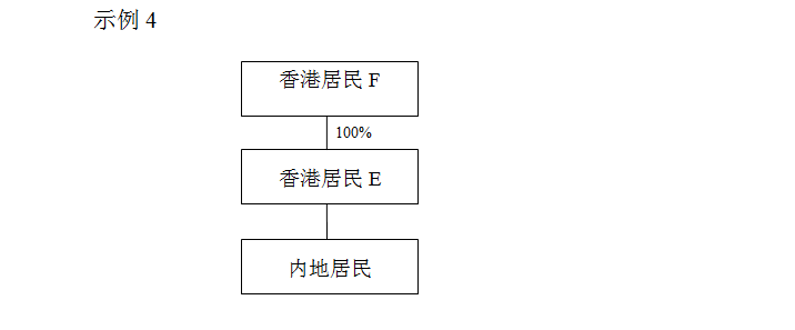 示例4投资架构,为本条第一款第(一)项规定的情形,香港居民E投资内地居民并取得股息,香港居民F直接持有香港居民E100%的股份,虽然香港居民E不符合“受益所有人”条件,但是,如果香港居民F符合“受益所有人”条件,应认为香港居民E具有“受益所有人”身份;