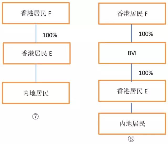 这里,实际就导致了一个非常奇怪的问题出现,就是根据9号公告第三条第一款的规定,只要香港居民F可以认定为“受益所有人”,只要他间接100%持有香港居民E(这里100%应该是直接按照持股比例相乘算,9号公告解读没特别说明不能按照间接上层持股超过50%按100%算这种方法),不管中间层是香港居民还是其他避税地企业(比如9号公告解读中的示例5就是一个BVI),香港居民E都可以直接认定为股息“受益所有人”。但是,根据9号公告第四条第四款,在间接控制申请人的主体属于那三类终极实体时,则要求这些终极实体间接持股的中间层必须是缔约国对方居民或中国居民才能直接认定的理由何在呢,这个是否属于文件中的一个bug呢,没有合理理由啊。即我们比较图④和图⑧,这里有什么样的理由可以解释,为什么图⑧中香港居民E可以直接认定股息“受益所有人”,而图④中香港居民B反而不能直接认定呢?我们在9号公告解读中没有看到任何合理解释。