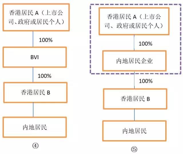 这里,左边④中,由于BVI公司不是香港居民企业,因此,这种情况下,就股息所得而言,香港居民B就不能直接被认定为受益所有人。这里不能“直接”认定,是否意味着香港居民B 就无法认定为受益所有人呢?比如,如果根据相关协议的约定,香港居民B取得内地居民股息后直接就支付给了BVI公司,BVI公司立刻就支付给了香港居民A,此时能否仍可以认定香港居民B的受益所有人身份呢,个人认为根据具体情况仍然有可探讨空间的。当然,如果BVI公司因为实际管理机构在香港能取得香港居民身份证明,则不存在这个问题了。
