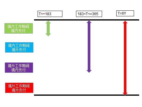 但是,很奇怪的是,为什么35号公告对于高管人员在境内居住时间累计不超过90天的情形只是规定了文字性规定,且没有给出计算公式呢?看我的独创“四色图”你就发现,在不超过90天的情况下,他的纳税义务是绿色+紫色,大家自己就可以看一下: