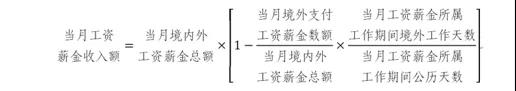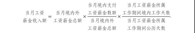 当月工资、薪金收入=当月境内外工资薪金总额*境外支付工资/当月全部境内外工资*境外工作天数/当月公历天数
