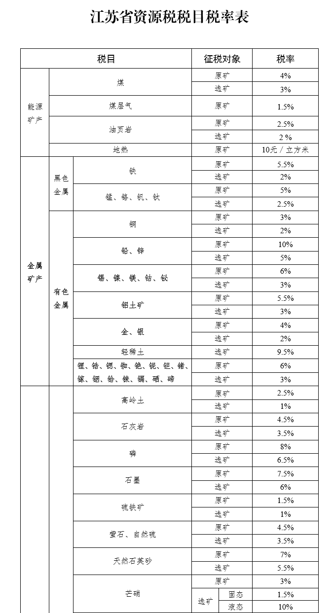 江苏省规定:《资源税法》规定实行幅度税率的税目,具体适用税率按照《江苏省资源税税目税率表》执行。