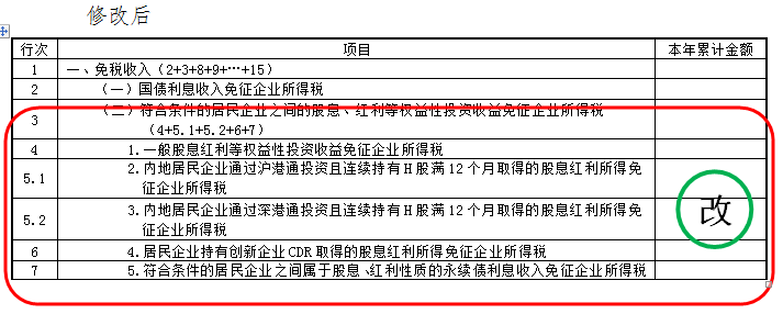 原第5行调整为第5.2行,名称修改为“3.内地居民企业通过深港通投资且连续持有H股满12个月取得的股息红利所得免征企业所得税”;