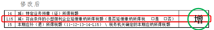 2.为了让查账征收小微企业通过填报企业所得税预缴纳税申报表自由选择是否享受延缓缴纳政策,在原表单第14行和第15行之间新增第L15行,项目名称为“减:符合条件的小型微利企业延缓缴纳所得税额(是否延缓缴纳所得税 □是 □否)”。