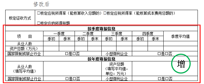 1.修改季度申报和年度申报中小微企业相关判定数据的填报方式。将原表单中的“按季度填报信息”和“按年度填报信息”调整至“核定征收方式”下方,并对该区域表单样式进行修改;