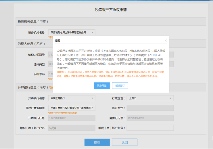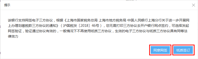 系统会根据选择签约的银行是否为网签银行进行提示,如果签约的银行已开通网签功能,则可以办理三方协议网签业务;未开通网签功能选择纸质签订。