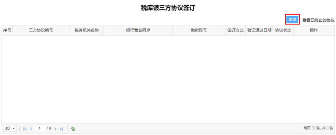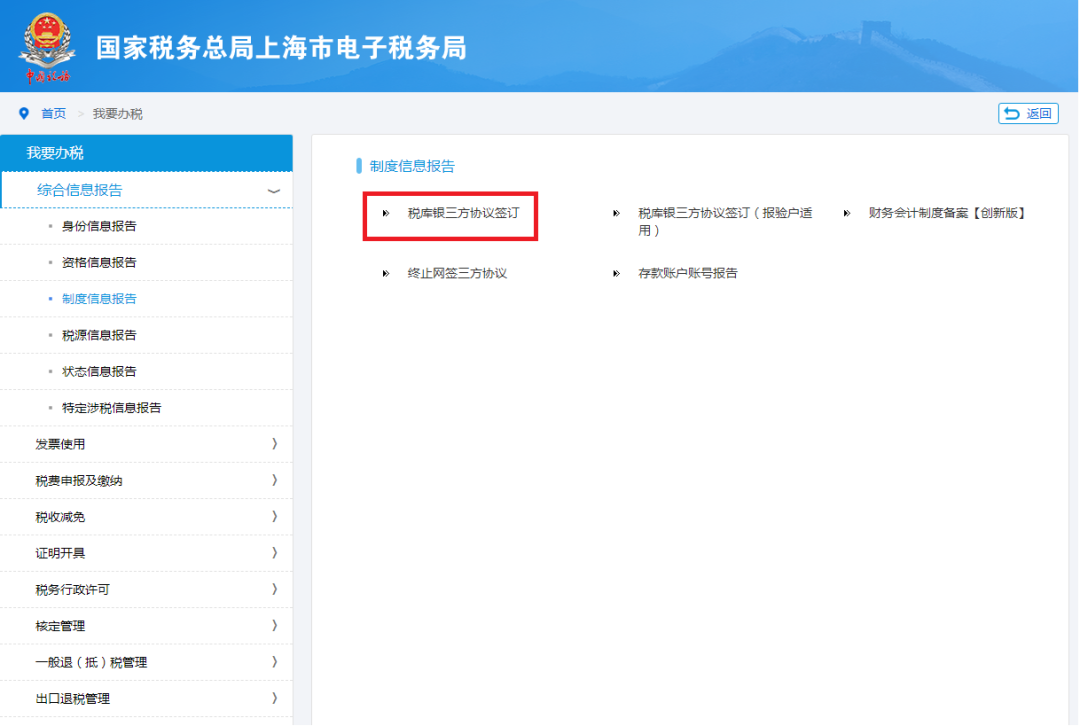 点击菜单栏中【我要办税】中的【综合信息报告】模块,在弹出页面左侧选择【制度信息报告】,选择【税库银三方协议签订】,点击进入办理页面。