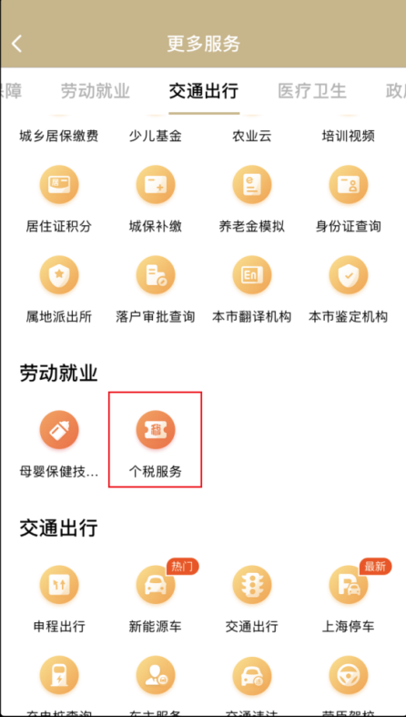 1.打开“随申办”APP,选择【办事】,点击【更多服务】,选择【劳动就业】—【个税服务】—【三方协议签订】。
