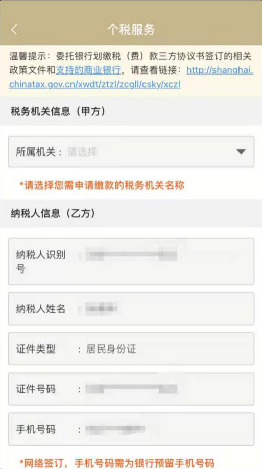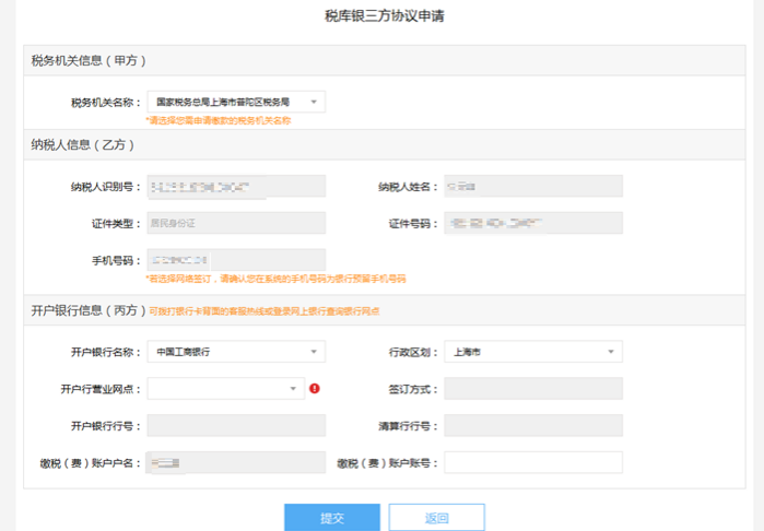 点击“新增”按钮,进入税库银三方协议申请界面,税务机关名称”选择对应的主管税务机关,注意签订三方协议的税务机关名称必须与您缴款的税务机关名称一致,否则将无法对应到申报缴税信息。网上办理仅支持居民身份证。录入正确的开户银行信息。“确认无误后,点击“提交”按钮。