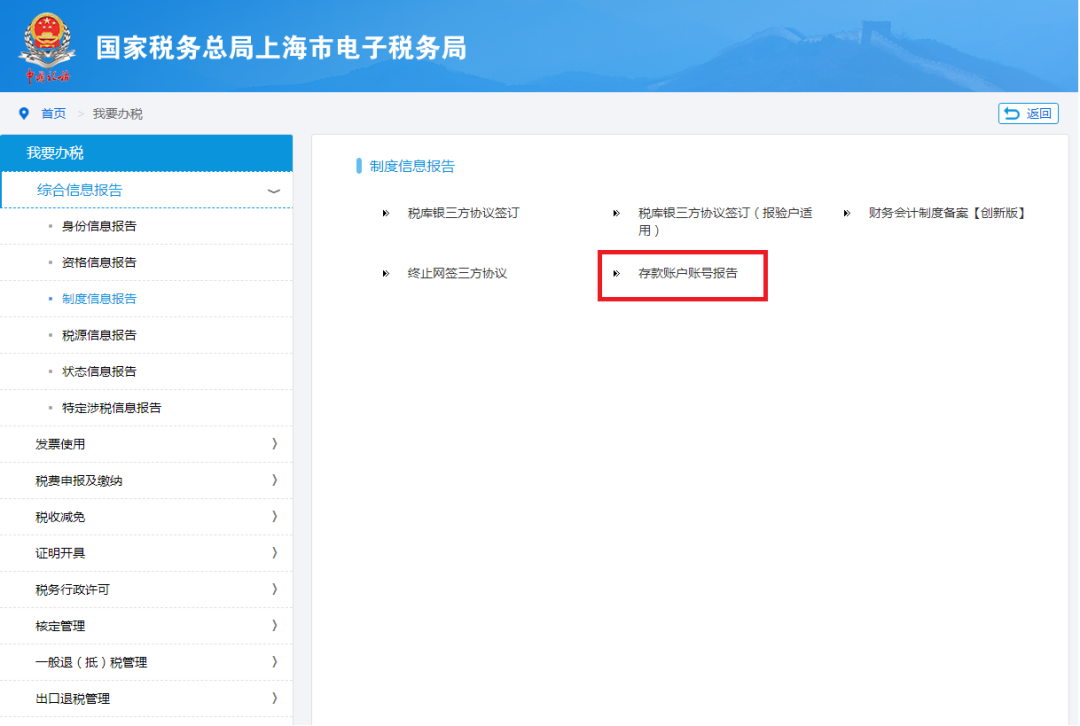 点击菜单栏中【我要办税】中的【综合信息报告】模块,在弹出页面左侧选择【制度信息报告】,选择【存款账户账号报告】,点击进入办理页面。