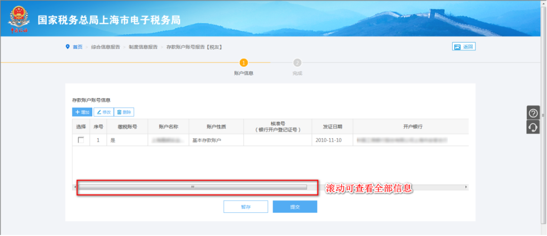 点击进入模块后,进入存款账户账号报告界面。系统将自动带出纳税人已有的银行账户信息,滚动下方滚动条可查看全部信息。纳税人可以在此模块新增、修改和删除账户信息。请按照真实的银行账户内容准确录入。