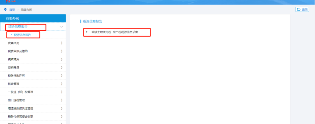 成功登录到上海市电子税务局后,点击菜单栏“我要办税”中的“综合信息报告”模块,在左边菜单栏里选择“税源信息报告”,然后在弹出页面右侧选择“综合税源信息报告(城镇土地使用税 房产税税源信息采集)”进入到登记页面。