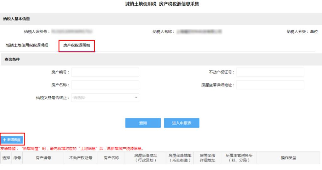 进入“城镇土地使用税 房产税税源信息采集”页面,进行新增土地或新增房产操作。