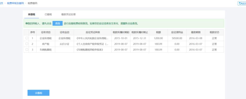 如需缴纳税费,则点击“税费缴纳”跳转至税费缴纳页面