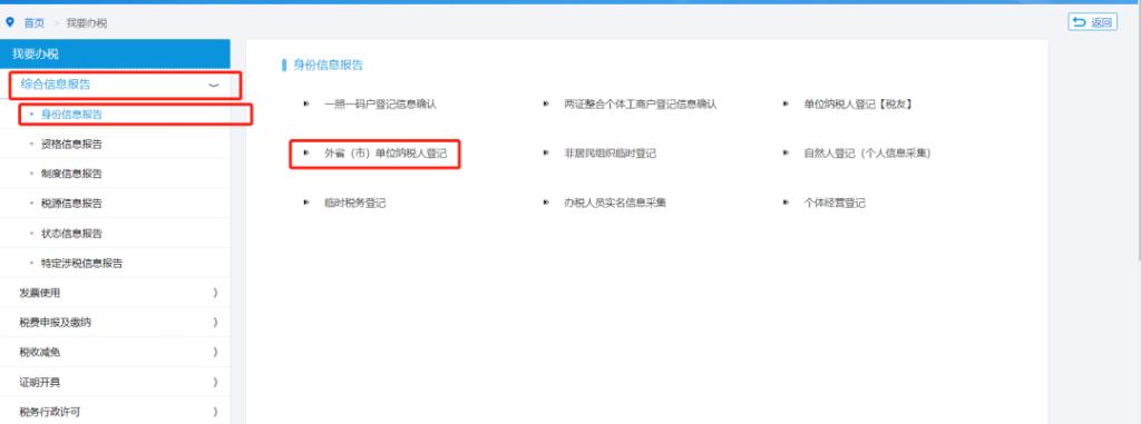 点击菜单栏中“我要办税”中的“综合信息报告”模块,在左边菜单栏里选择“身份信息报告”,然后在弹出页面右侧选择“外省(市)单位纳税人登记”进入到登记页面。