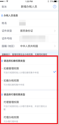 4、录入办税人员信息,权限类型分为:①扣缴管理权限:可自行或授权他人办理扣缴和集中申报;②扣缴办税权限:可办理扣缴和集中申报;③代理管理权限:可自行或授权他人办理代理申报,并进行委托分配;④代理办税权限:可办理代理申报。