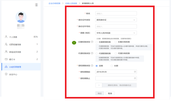 根据授权人员情况,将授权期限类型分为定期和长期。选择长期,则只需填写授权期限起;选择定期,需要填写授权期限起和授权期限止。