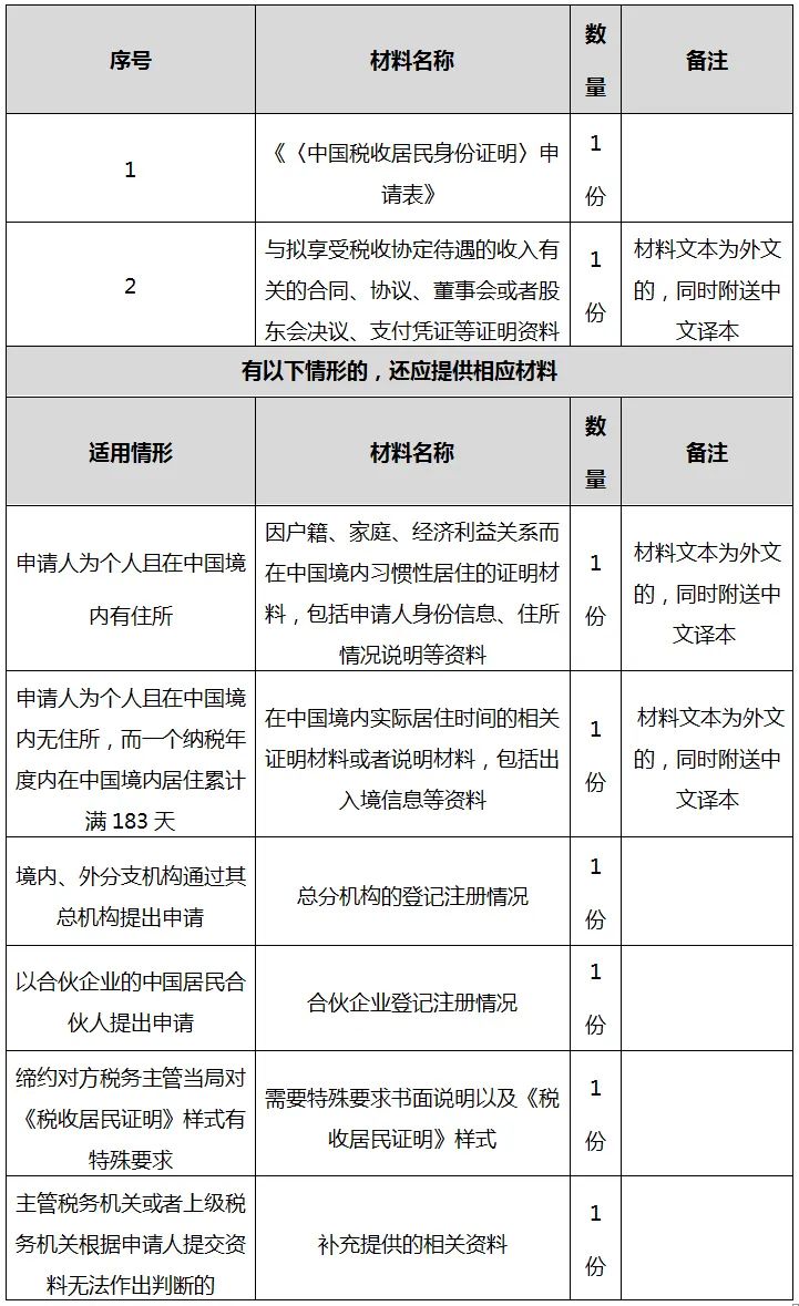●申请《中国税收居民身份证明》申请表;