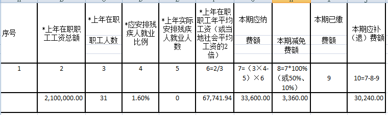 二哥税税念公司2020年工资总额210万,职工人数31人,四川省要求的残疾人就业安排比例是1.6%,实际公司安排残疾人0人,安置比例小于1%(实际安置比例为0%),那实际我们就只按照应纳费额的90%缴纳,相当于减免了10%的费用。