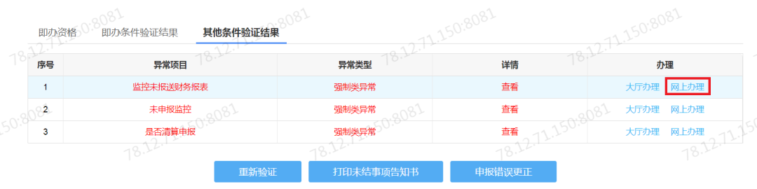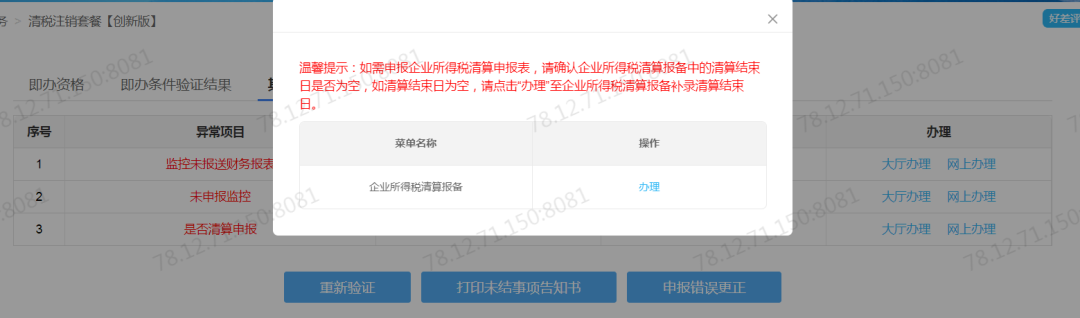 进入清税注销套餐中 “其他条件验证结果”页签,点击监控事项“是否清算申报”办理列的“网上办理”按钮,完成清算报备。