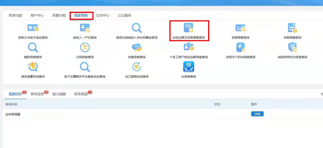 1. 在电子税务局提交申请成功的事项,可以在电子税务局首页下方【事项进度】—【办税进度及结果信息查询】中进行查询受理状态。