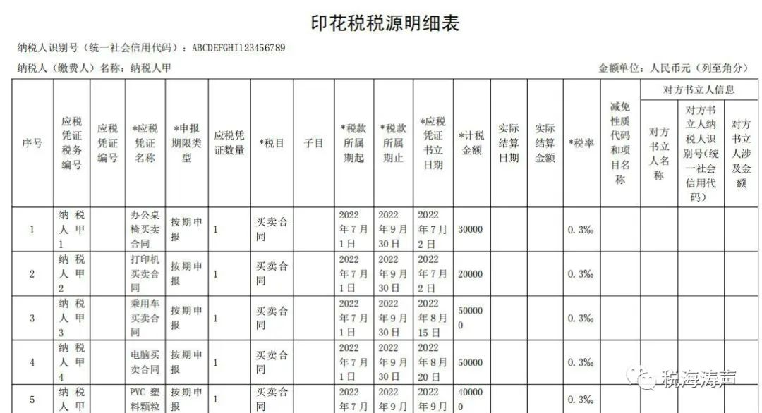 纳税人应当根据书立印花税应税合同、产权转移书据和营业账簿情况,填写《印花税税源明细表》,进行财产行为税综合申报。合同数量较多且属于同一税目的,可以合并汇总填写《印花税税源明细表》。