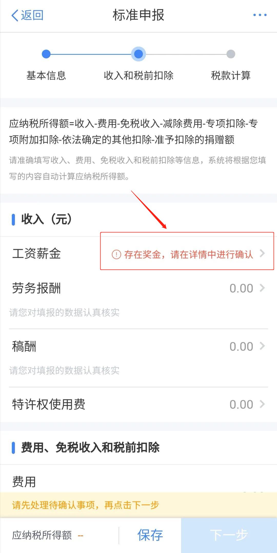 (三)点击【存在奖金,请在详情中进行确认】的红字提示,进入【奖金计税方式选择界面】;