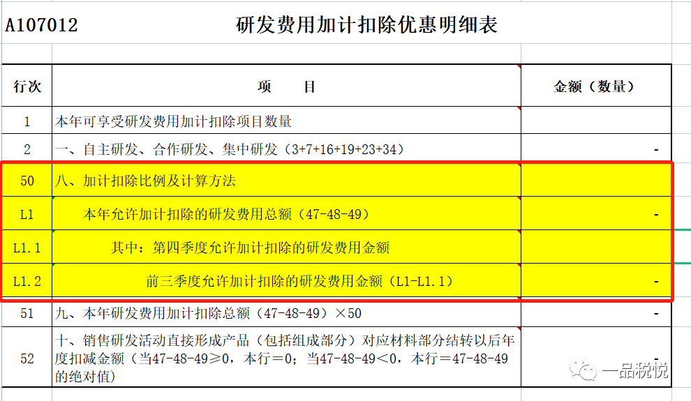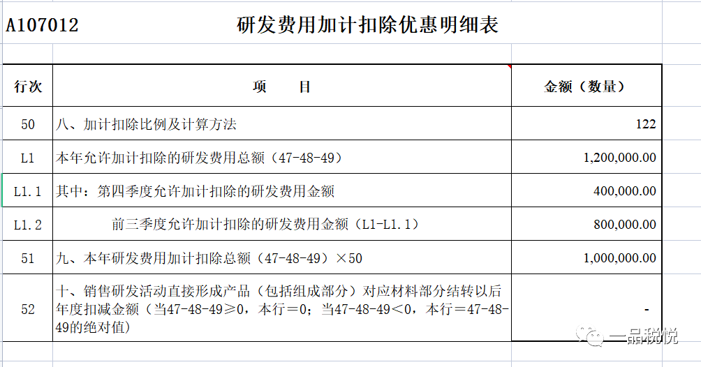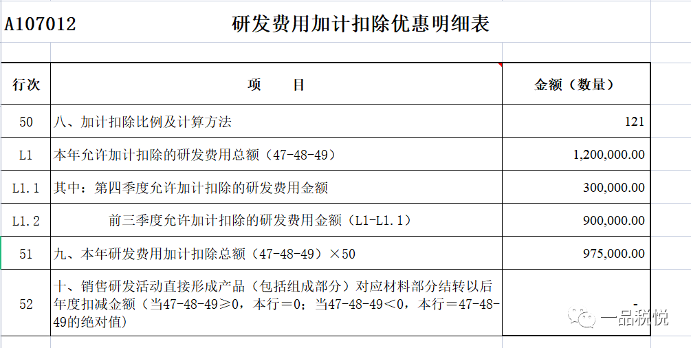 显然,乙公司选择按比例计算更为合适。那么,乙公司在填报《研发费用加计扣除优惠明细表》(A107012)时,应在第50行“八、加计扣除比例及计算方法”填入代码121,“前三季度75%且第四季度100% (其他企业)按比例计算”,在L1行“本年允许加计扣除的研发费用总额”中填写“1200000”,L1.1行“其中:前四季度允许加计扣除的研发费用金额”中填写“300000”,在L1.2行“前三季度允许加计扣除的研发费用金额”中填写“900000”,在第51行“九、本年研发费用加计扣除总额”填写“975000”。