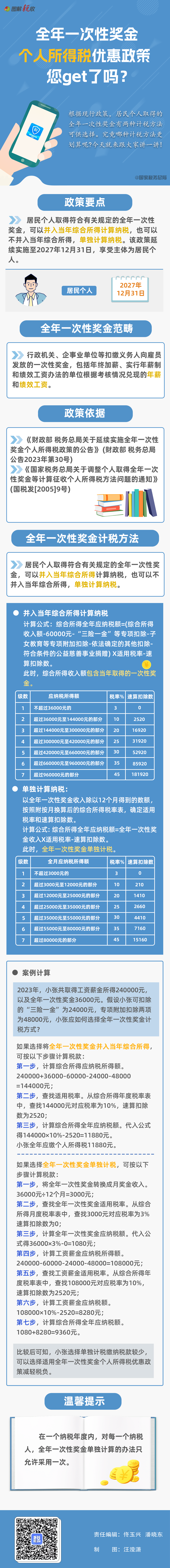 按照政策规定,居民个人取得符合有关规定的全年一次性奖金,可以并入当年综合所得计算纳税,也可以不并入当年综合所得,单独计算纳税。2023年度个人所得税综合所得汇算正在进行中,年终奖计税方式如何选择更划算?一图读懂↓