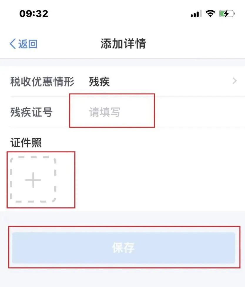 在“添加详情”页面,选择相应税收优惠情形,若选择的税收优惠情形为残疾或烈属,需录入相应证件号码和上传证件照片,点击【保存】;