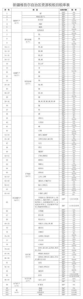 一、资源税法规定实行幅度税率的资源税税目,具体适用税率按照本决定所附《新疆维吾尔自治区资源税税目税率表》执行。
