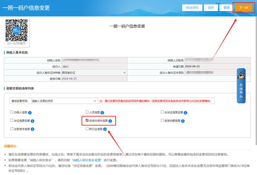 三、一照一码户登记信息变更页面,在此界面勾选“投资方相关信息”系统会带出变更项目,请您自行增加或删除修改,完成后点右上角下一步提交即可。