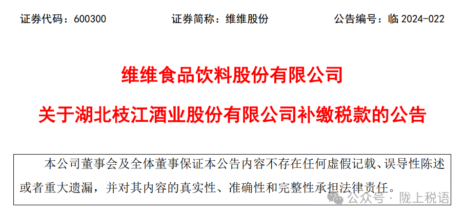 枝江酒业为公司原控股子公司,2020年公司将所持有的枝江酒业71%的股权全部转让,2020年末公司已不再将枝江酒业纳入合并范围。根据公司转让枝江酒业股权时与江苏综艺控股集团有限公司(以下简称“江苏综艺”,现枝江酒业之控股股东)签署的相关协议,如税收机关因枝江酒业存在未缴或者少缴税款而对其进行交割日前税收追溯征收的,由公司负责补缴前述税款(陇上税语注:股东代为负担的税款及滞纳金在税前不能列支)。