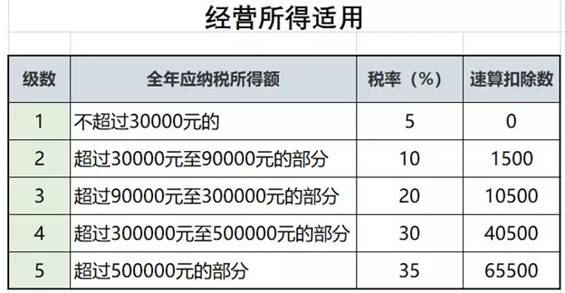 从“经营所得”税率表中找到税率20%和速算扣除数10500,然后计算: