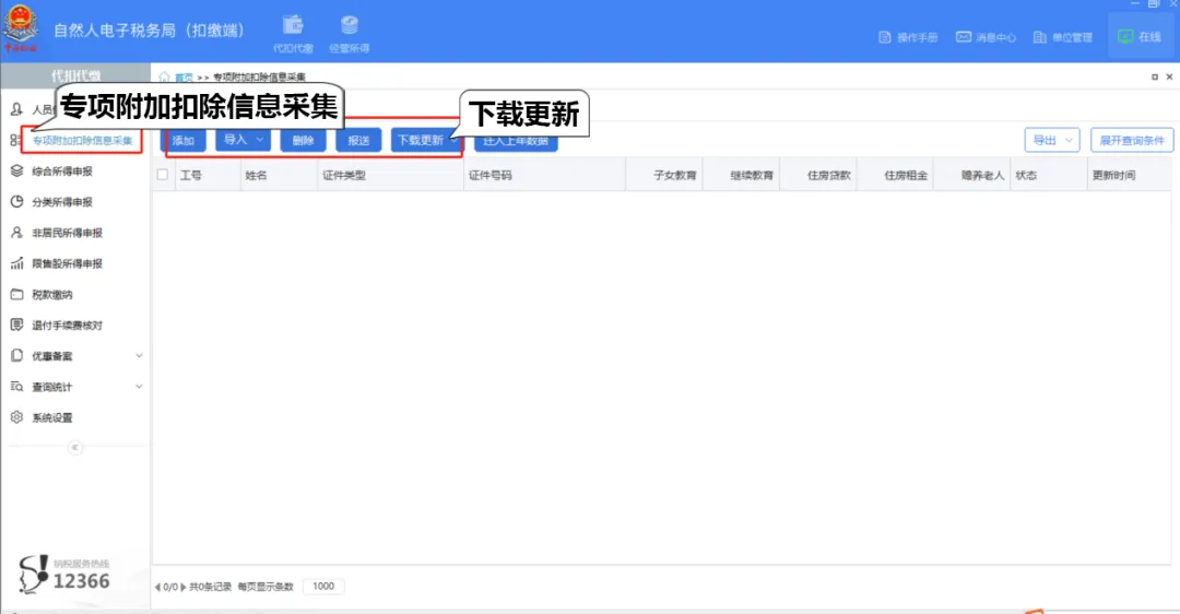 2.采集专项附加扣除信息。点击左侧菜单栏【专项附加扣除信息采集】,如当期有员工存在新报送的专项附加扣除信息,需要进行【下载更新】。
