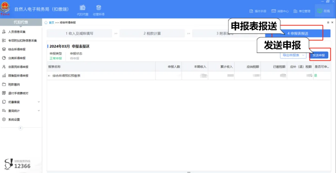 (6)点击【申报表报送】,核实申报表报送数据,确认无误后,点击【发送申报】即可。