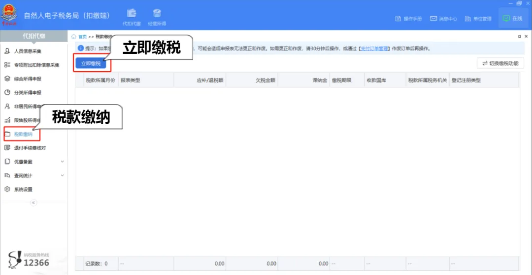 4.缴纳税款。点击左侧菜单栏【税款缴纳】,勾选需要缴税的数据,点击【立即缴税】进行税款缴纳即可。
