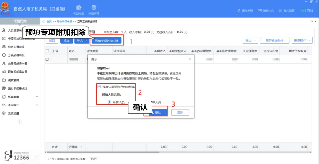 (3)点击【预填专项附加扣除】,在弹出的提示框内选择预填内容和预填人员范围后,点击【确认】,可自动将采集的专项附加扣除信息下载到对应纳税人名下,自动填入申报表。