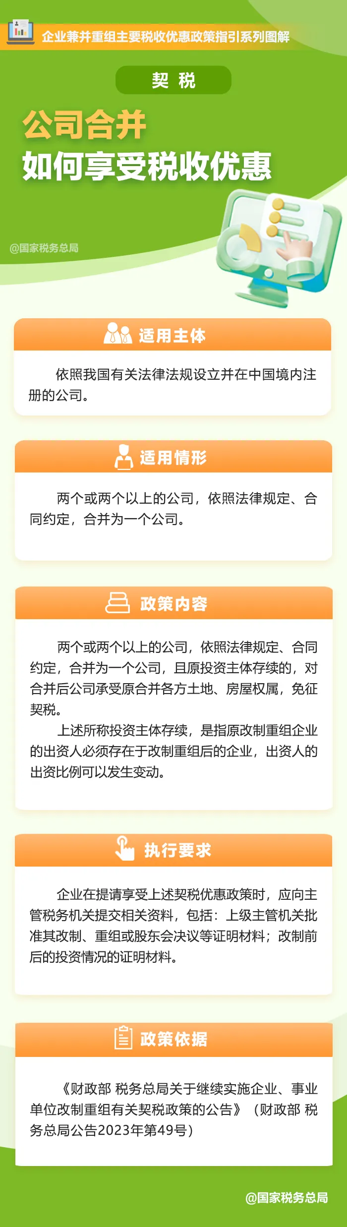 为引导企业正确适用兼并重组税收政策,财政部、税务总局等部门编写了《企业兼并重组主要税收优惠政策指引》,对现行有效的支持企业兼并重组主要税收优惠政策和税收征管文件进行了梳理,并按照企业兼并重组的类型,分门别类明确了适用主体、适用情形、政策内容、执行要求及政策依据等内容,为纳税人提供简明易行、获得感强的操作指南。