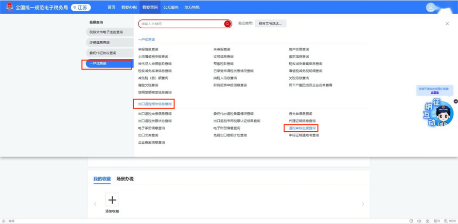 3、如想查询办理进度及结果,点击【我要查询】-【一户式查询】-【出口退税相关信息查询】-【退税审核进度查询】。