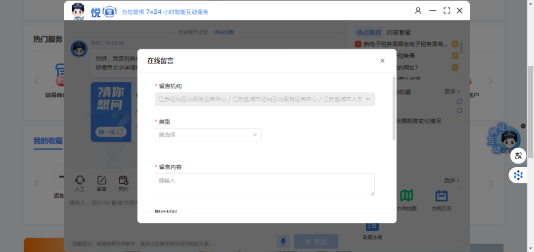 进入征纳互动服务界面,在对话框输入互动内容,或者语音输入咨询内容,点击【发送】,由智能机器人“悦悦”为您提供7×24小时智能互动服务。