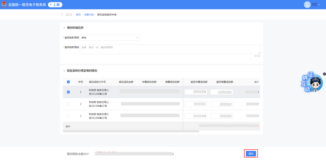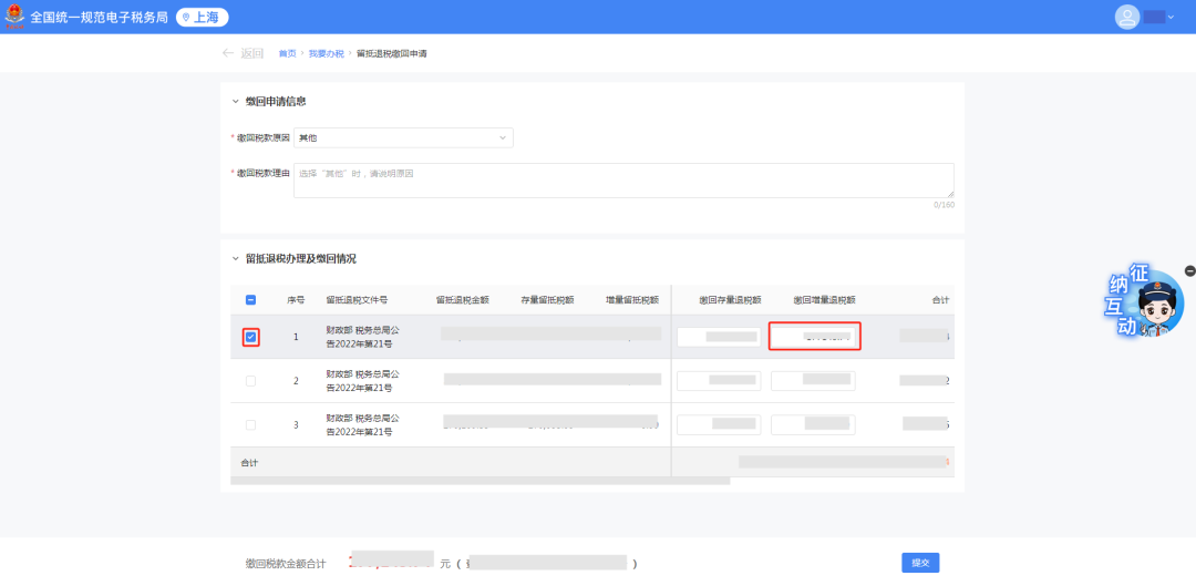 勾选需要提交的留抵退税信息,如果需要修改缴回存量退税额或缴回增量退税额,点击文本框进行数值编辑操作。