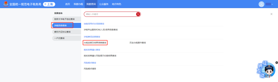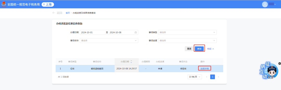 1.留抵退税缴回成功后,纳税人可登录新电子税局,依次点击菜单路径:【我要查询】-【涉税信息查询】-【涉税事项进度查询】-【办税进度及结果信息查询】,进入功能后,找到提交的申请信息,点击进度详情按钮即可获取当前最新办理进度。受理通过后,缴回的留抵退税将形成应征税款,请前往【税费缴纳】完成缴款。