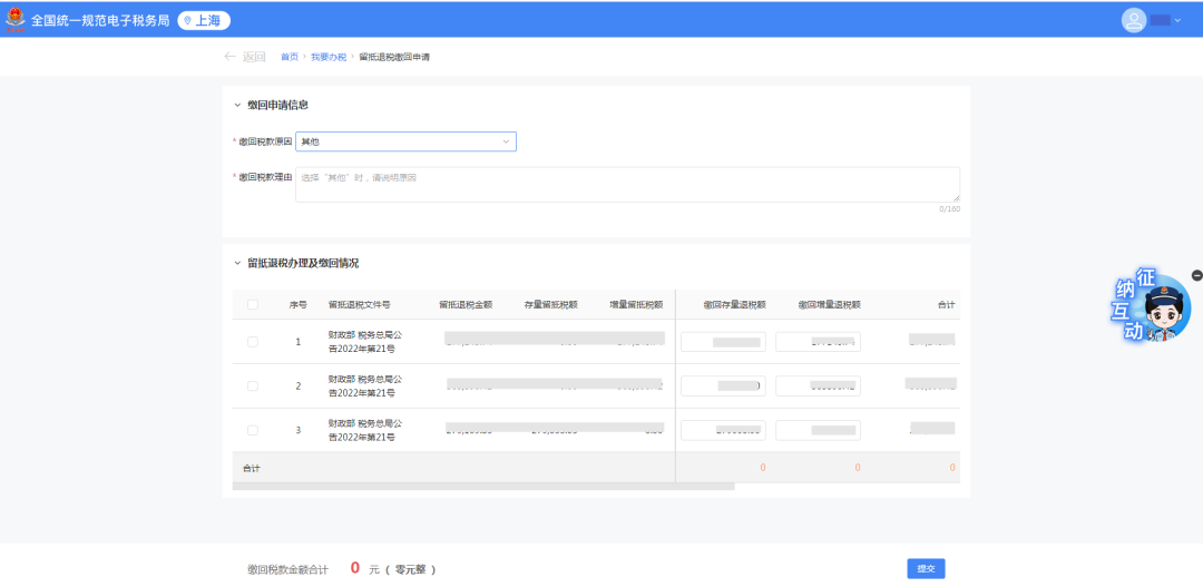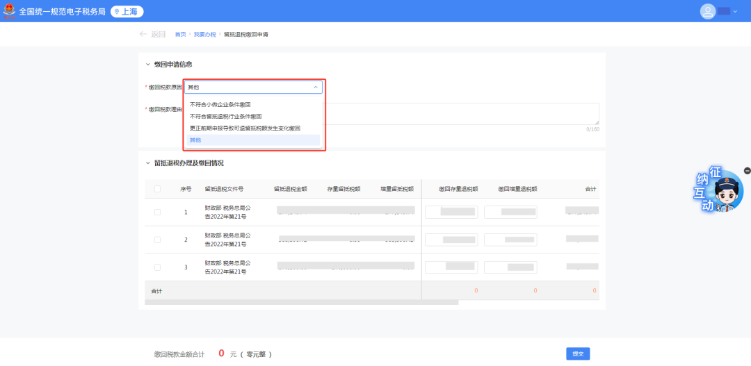 缴回税款原因默认带出“其他”,缴回税款理由必填。另外缴回税款原因还可选择不符合小微企业条件缴回、不符合留抵退税行业条件缴回、更正前期申报导致可退留抵税额发生变化缴回。