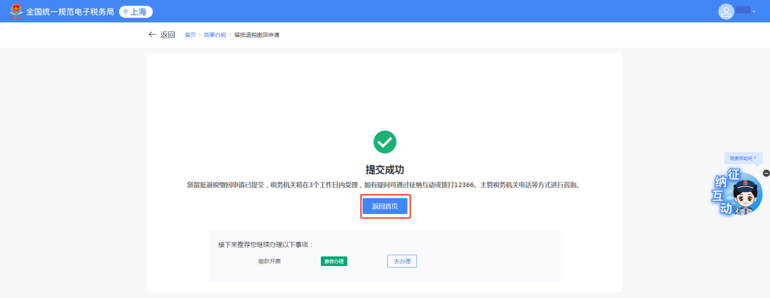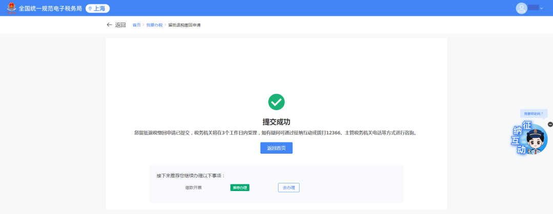 系统跳转至留抵退税缴回申请提交成功页面。