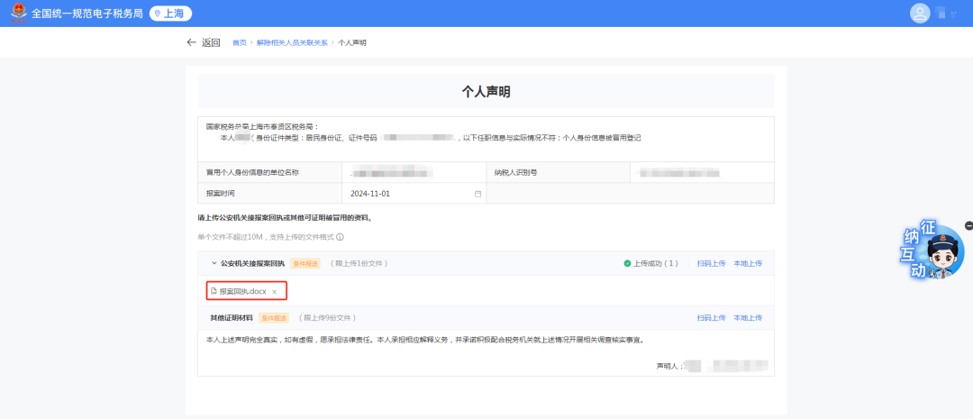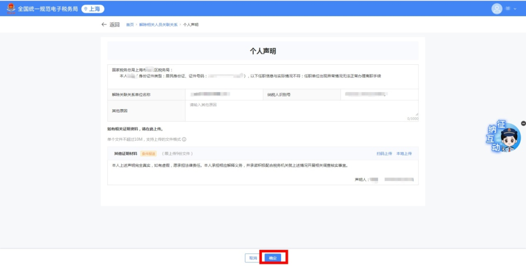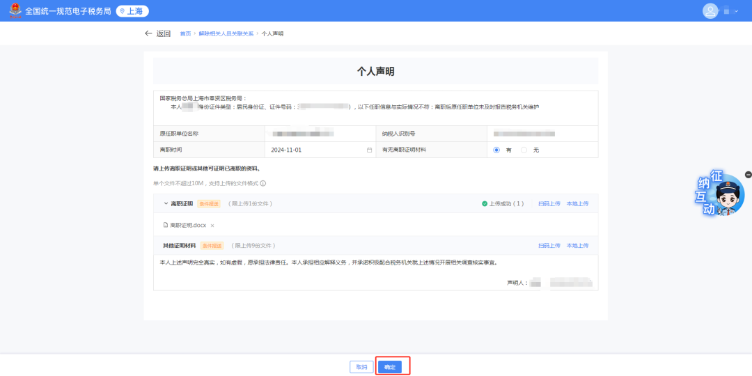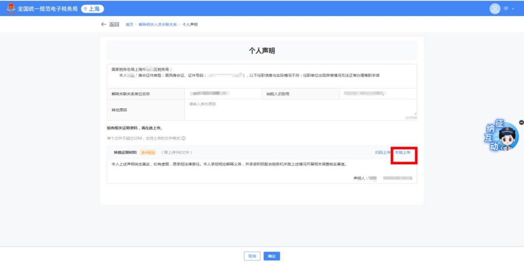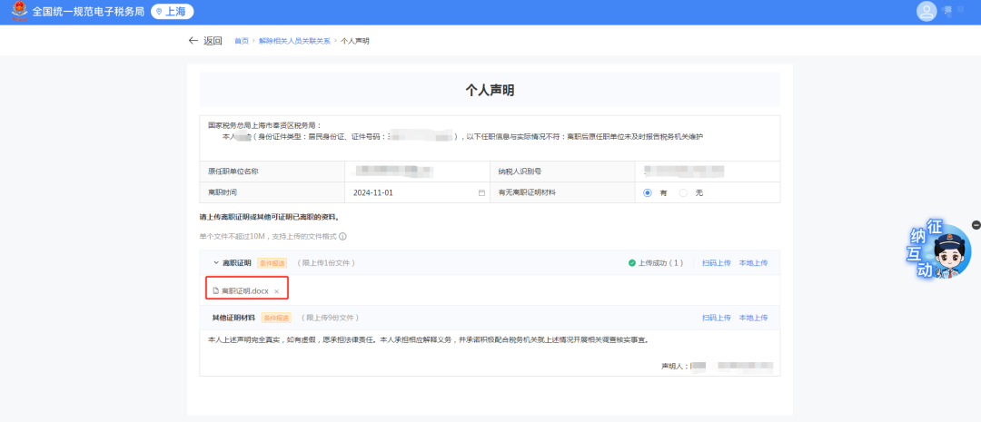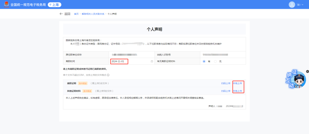 1)跳转个人声明界面,选择【离职时间】,点击【上传】上传对应资料。